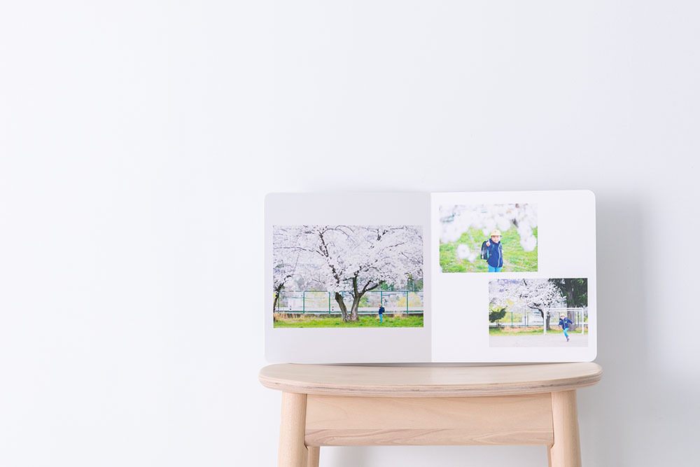 6ページの絵本型アルバムです。小さめサイズで角が丸くなっているのが特徴的です。ページ数が少なくても厚みがあってしっかりとした作りになっています。